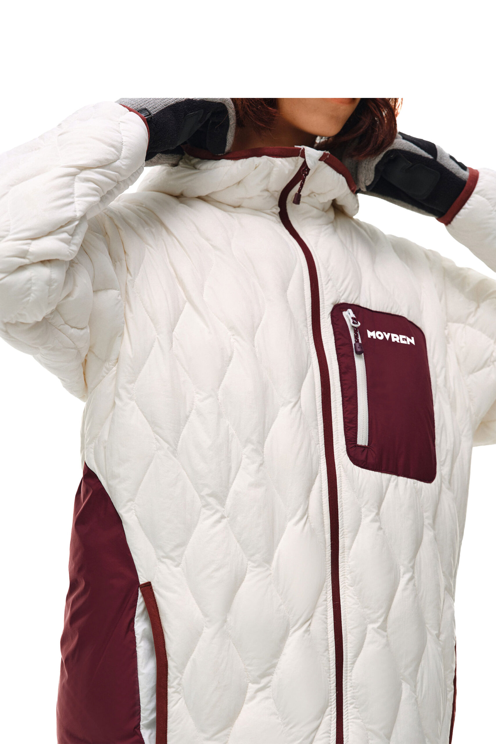 시그니처 컬러 블로킹: 화사한 아이보리 바디를 바탕으로 가슴 포켓, 지퍼 라인, 측면 패널에 딥 버건디 컬러를 배색하여 세련된 무드를 극대화했습니다.